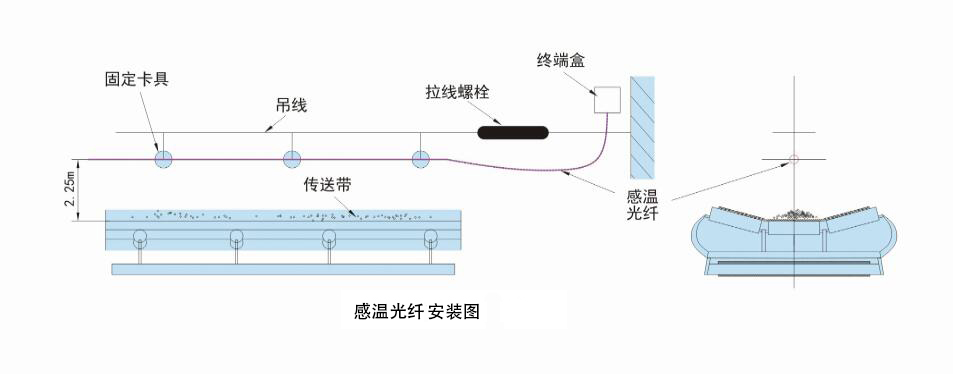 在傳送帶寬度不大(dà)于0.4m的條件下,用一根和(hé)傳送帶長度相等的感溫光纖來(lái)保護。感溫光纖應是直接固定于距傳送帶中心正上(shàng)方不大(dà)于2.25m的附屬件上(shàng)。附屬件可(kě)以是一根吊線,也可(kě)以借助于現場(chǎng)原有(yǒu)固定物。吊線的作(zuò)用是提供一個(gè)支撐件。 每隔75m用一個(gè)拉線螺栓來(lái)固定吊線。以防感溫光纖下落,每隔4m~5m用一個(gè)緊固件将感溫光纖和(hé)吊線卡緊,吊線的材料宜用φ2mm不鏽鋼絲(在條件不具備時(shí)可(kě)用鍍鋅鋼絲來(lái)代替)。安裝方法如圖所示: