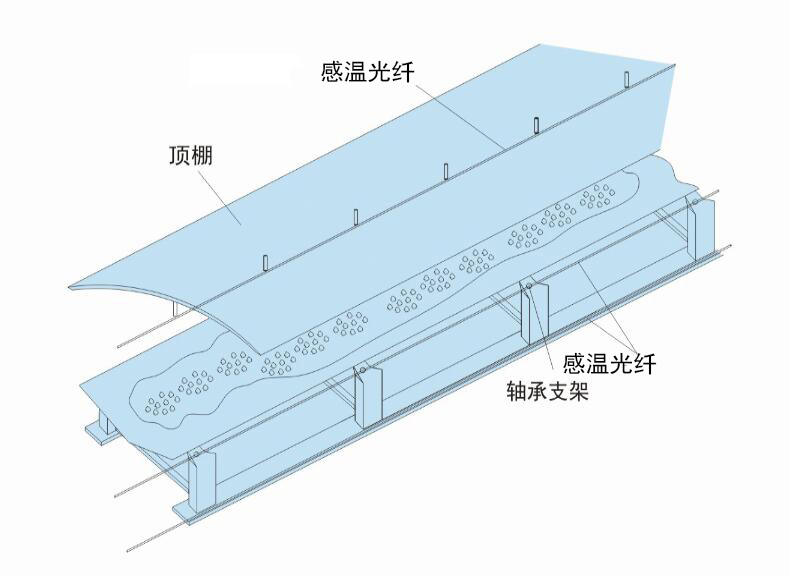 當傳送帶寬度大(dà)于0.4米時(shí),将感溫光纖安裝于靠近傳送帶的兩側。可(kě)将感溫光纖通(tōng)過導熱闆和(hé)滾珠軸承連接起來(lái)以探測由于軸承摩擦和(hé)煤粉積累引起的過熱。一般設計(jì)安裝原則是在不影(yǐng)響平時(shí)運行(xíng)和(hé)維護的情況下根據現場(chǎng)情況而定。如果火(huǒ)災危險系數(shù)較大(dà),可(kě)以在傳送帶上(shàng)方和(hé)兩側同時(shí)敷設感溫光纖。安裝方法如圖所示: