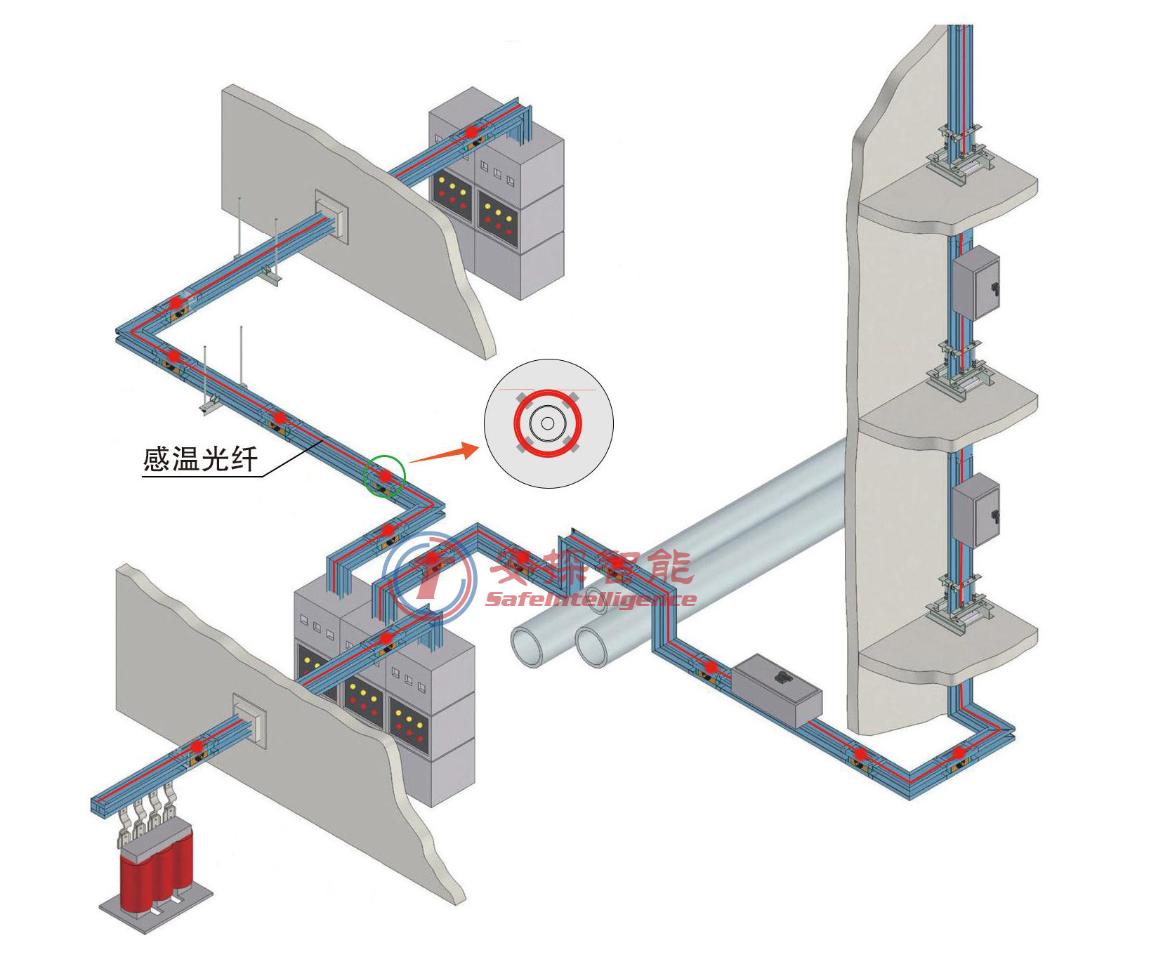感溫光纖沿母線回路方向敷設,在每個(gè)母線連接處盤繞光纖測溫環,重點監測每個(gè)母線連接處的溫度情況。感溫光纖應固定在母線上(shàng)表面,除非安裝位置受限,否則不建議将光纖固定在母線下表面。可(kě)視(shì)現場(chǎng)實際情況将光纖固定在母線上(shàng)表面或下表面;請(qǐng)勿将光纖固定在側闆外側。