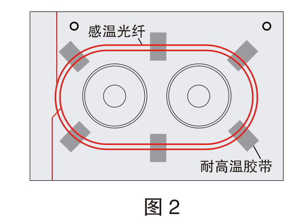 光纖直接固定在連接處上(shàng)蓋表面,盤繞2圈光纖。耐高(gāo)溫膠帶固定。考慮到布線統一性及後續校(xiào)準調試,每個(gè)連接處的感溫光纖安裝長度一緻。如圖2所示: