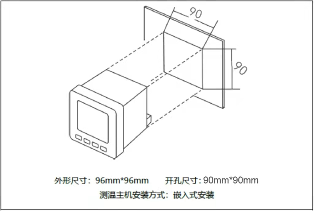 無線測溫主機采用面闆嵌入式安裝,設備外形尺寸為(wèi)96mm*96mm,面闆開(kāi)孔尺寸為(wèi)90mm*90mm。