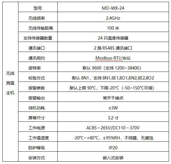 無線測溫主機電(diàn)源支持AC85~265V/DC110~370V,支持2路485接口,支持1路繼電(diàn)器(qì)報警輸出(常開(kāi)幹接點)。